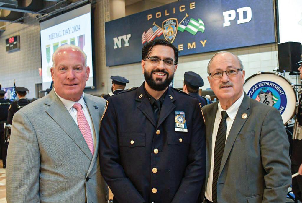 Officer Sumit Sulan (center), pictured here with Detectives’ Endowment Association president-elect Scott Munro (left), was awarded with the New York Police Department’s Medal of Honor for his bravery in 2022 after two fellow officers were gunned down by a “career criminal” during a domestic dispute check.