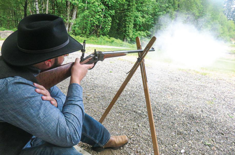 Kyle Kirkpatrick fires his .45-70 over cross-sticks at a 200-yard target during a shooting contest at a western Washington black powder cartridge club’s Buffalo Camp.