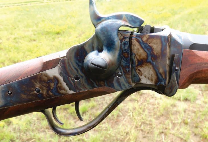 A recent rifle made by C. Sharps Arms with vivid casehardening colors on the action.