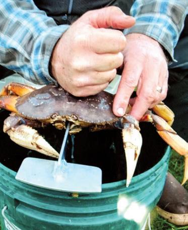 The Crab Cracker allows you to measure your Dungeness crabs to determine which ones are legal to keep, and then crack them in half over the top of a 5-gallon bucket, thereby separating the two clusters from the shell and guts. Crabs cleaned this way take up half as much space as whole crabs, so you can cook twice as many in your kettle.