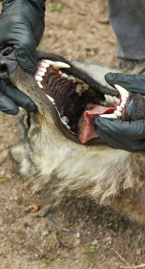 one, if not two of the pack members. That day, we checked a series of trap sites, and at the second to last set, we found a young, 2-year-old male wolf.