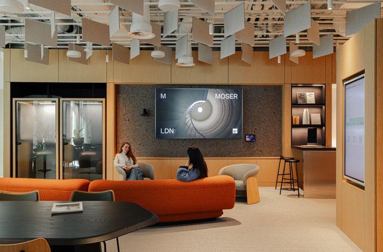 M Moser’s London Living Lab redefines workplace hospitality by promoting focus, collaboration, and employee experience. Driven by internal change champions and employee insights, it uses smart technology to refine spaces over a decade. Achieving improved productivity (82%), welcome (81%), and collaboration (90%), the design prioritises sustainability through reused materials and low-carbon choices, setting a benchmark for adaptive, high-performance