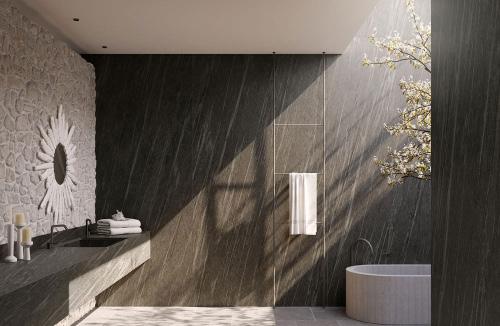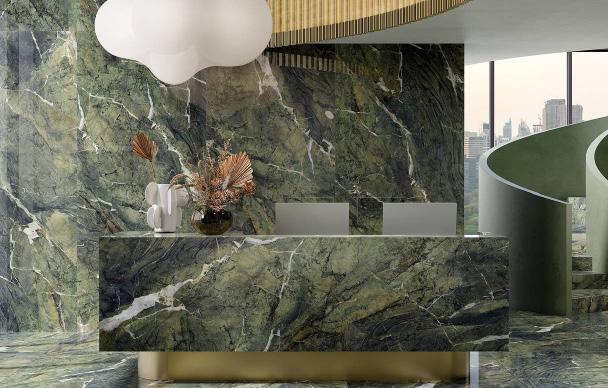Fantastic Green Maximus Mega Slabs from RAK Ceramics combine two major interior design trends: marble-inspired surfaces and nature. These porcelain slabs create seamless, grout-free spaces, offering versatile designs for kitchen islands, bathroom walls, hotel lobbies or feature walls. The large-format slabs are lightweight, durable and easy to clean, which – as well as their heat resistance and recyclability – makes them ideal for a wide range of uses.