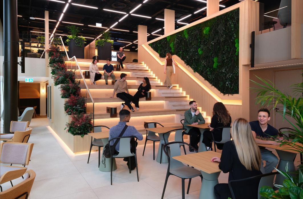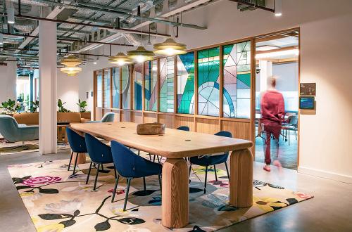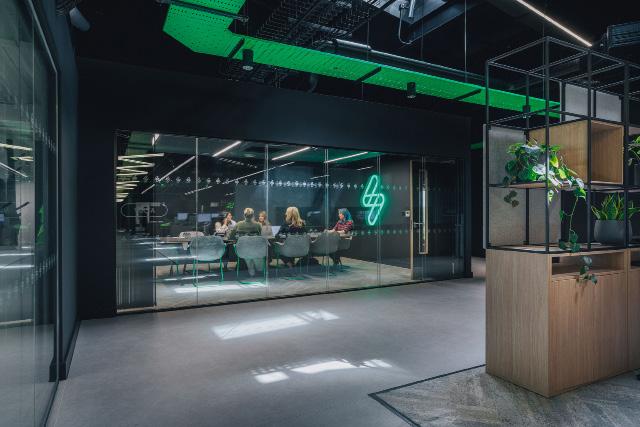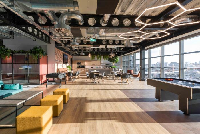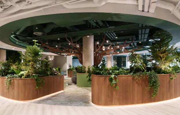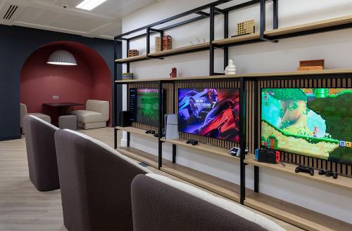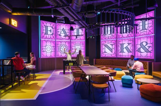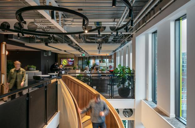 Avalanche Studios Group collaborated with Overbury for their new space in Liverpool’s St Paul’s development. The new environment emphasises people, with a design inspired by nature, featuring large-scale wall graphics. It caters to the needs of a young, expanding team, including neurodivergent team members, with features such as controllable lighting and acoustics.