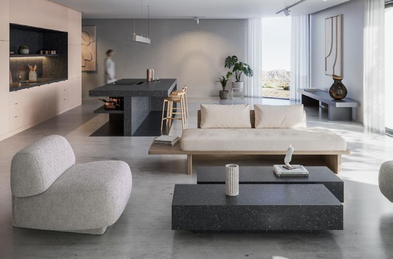 Neolith’s newest product range, Atmosphere, epitomises the pinnacle of design and innovation in the sintered stone market. This range, featuring four groundbreaking colours—WhiteSands, Rapolano, Artisan, & Ignea—sets a new standard for surface materials, offering unparalleled aesthetics, durability & functionality. Neolith Ignea has a 98R seal for recycled material, meaning it uses up to 98% recycled materials.