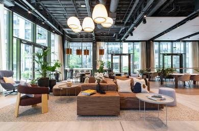 Redefining sustainable commercial office developments in Yorkshire, 11 & 12 Wellington Place is one of the most energy efficient buildings in Leeds and the first development outside of London to achieve a NABERS design reviewed target rating of five stars. With the buildings fully let, the business lounge in 12 Wellington Place creates a multifunctional space for tenants and visitors.