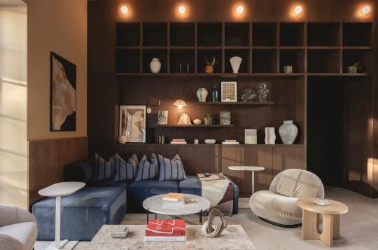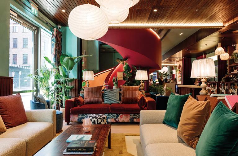 Roco represents an evolution of the office-toresidential typology, providing much-needed housing in Liverpool City Centre. It adopts some of the concepts of co-living, but with spacious living areas and a community hub at the base of the building, which helps create more permeability with the surrounding area. Loaded with 70s design prompts, the scheme combines timber storage, concrete and glass sconces to create a warm residential ambiance.