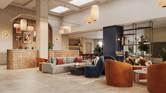 The recently completed 4-Star Hotel Indigo, designed by Chapman Taylor for the Castlebridge Group, features a 100-key accommodation capacity along with a 100-cover high-end dining restaurant, equipped with a versatile private dining and meeting room and a mini gym. Additionally, a 40-person capacity bar and a guest lounge welcome visitors on the ground floor, strategically positioned next to the main pedestrian thoroughfar for a lively frontage.