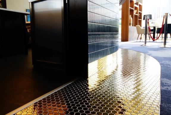 Strengthened using Titanium and Porcelain, the gold hexagonal mosaic of Architile’s Real Gold Hex range gives a frost, scratch, stain and slip resistant glaze with impressive aesthetics. The high intensity heat firing process of the mosaic, along with the refined blend of natural minerals (white clay, feldspar and kaolin) with added titanium, creates a hybrid and near indestructible glaze that will last the life of the building.