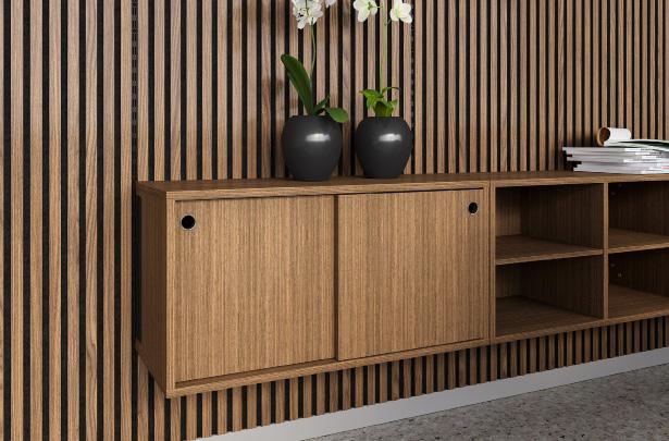 Gilmakra of Sweden’s Ablis shelving system is created to fit perfectly with rails, which can be used either with ribbon wall panels or as freestanding shelving units. When combined with the brand’s wall panels, the rail blends discreetly between the panels, creating the illusion of floating shelves. Gilmakra of Sweden’s cabinets are available both with elegant sliding doors and in open versions, and the Ablis shelving system is available in high (book end) or low versions.