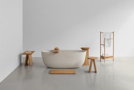 Designed by Stefan Diez, the products have been developed and manufactured by the interior label e15 for the German bath manufacturer Kaldewei. Diez works with both Kaldewei and e15. The furniture in the new collection is made from solid European oak. Comprising of a stool and bench, a footboard, a towel rail and a bathtub bridge and are complemented by accessories made of soft, water-repellent leather.