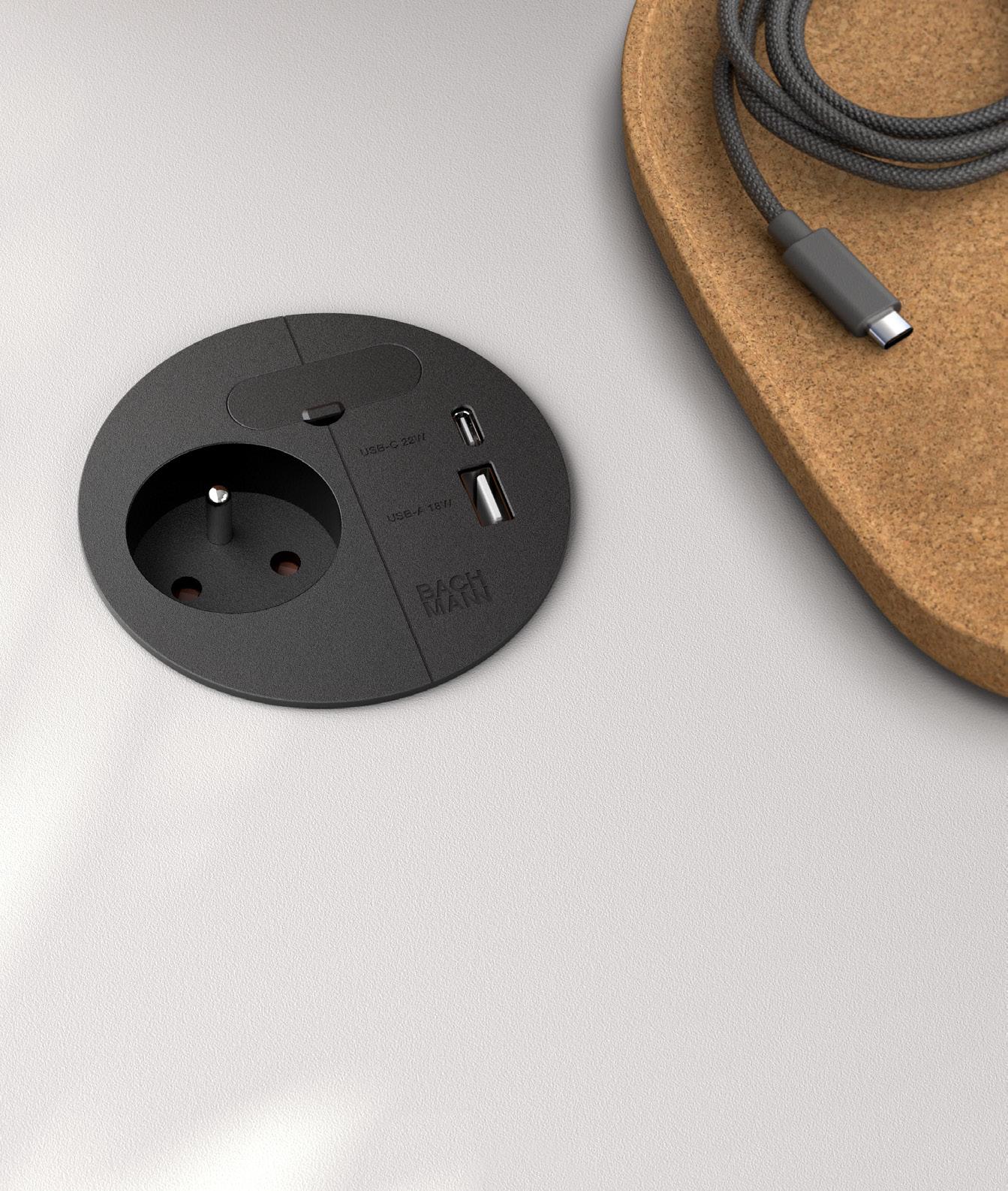 A neat and vibrant on-desk power module with a UK socket and a dual port USB Type C adaptive fast charger, with a maximum 65W, for charging high powered laptops, tablets and smart phones.