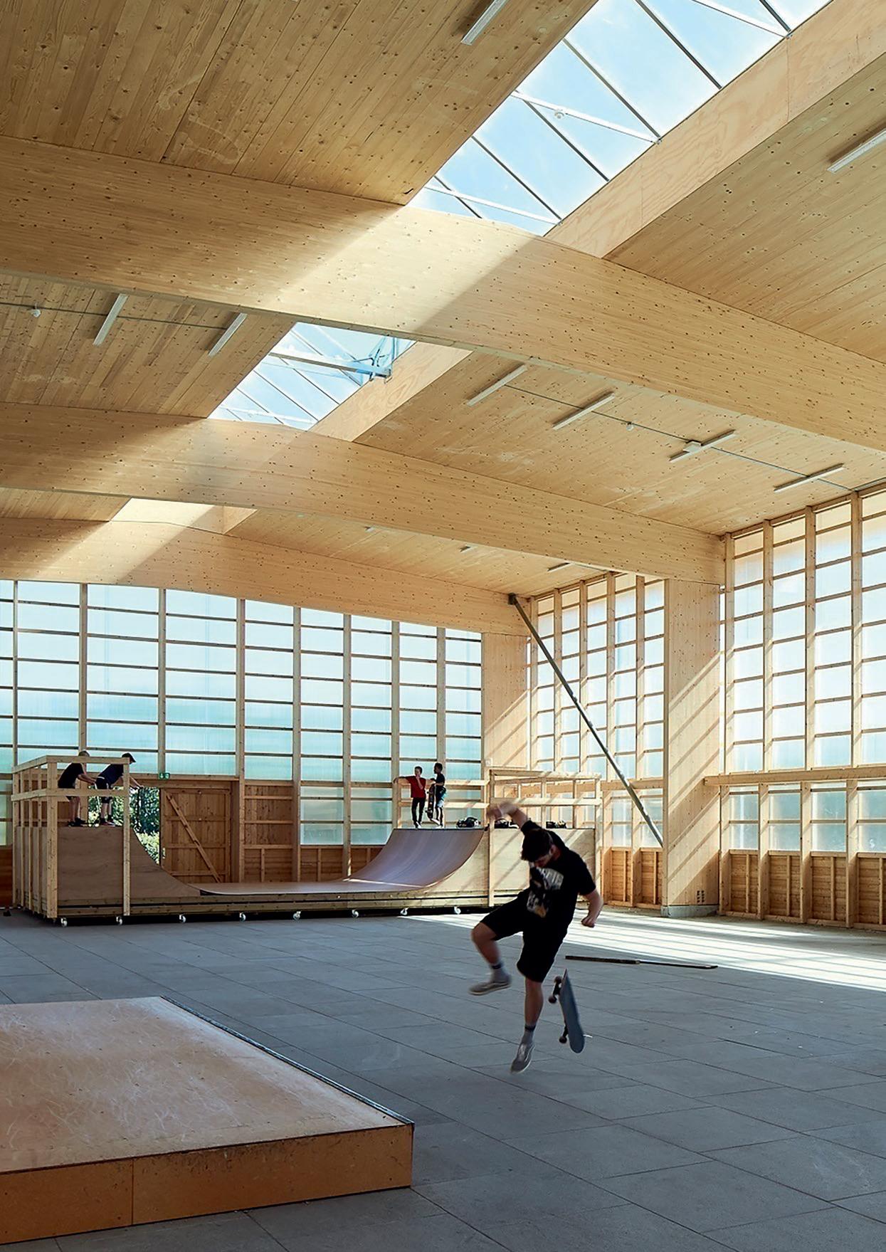 Det er også muligt, at lave flade tage med funktion, f.eks. på lege pladser, i byggerier med træ/hybrid som bærende konstruktion, men der er ikke nogen specielle fordele ved at bruge træ i flade tage for ophold. Her findes de samme udfordringer, som ved andre konstruktionstyper, nemlig den store belastning og især den rytmiske belastning, der kommer fra en legeplads. Tungt byggeri har her en fordel i forhold til let byggeri, men det kan man dimen sionere sig ud af. Vælger man et træ/beton kompositdæk, har man styrke og svingningsmæssige egenskaber, der ligger tæt op ad et huldæk.