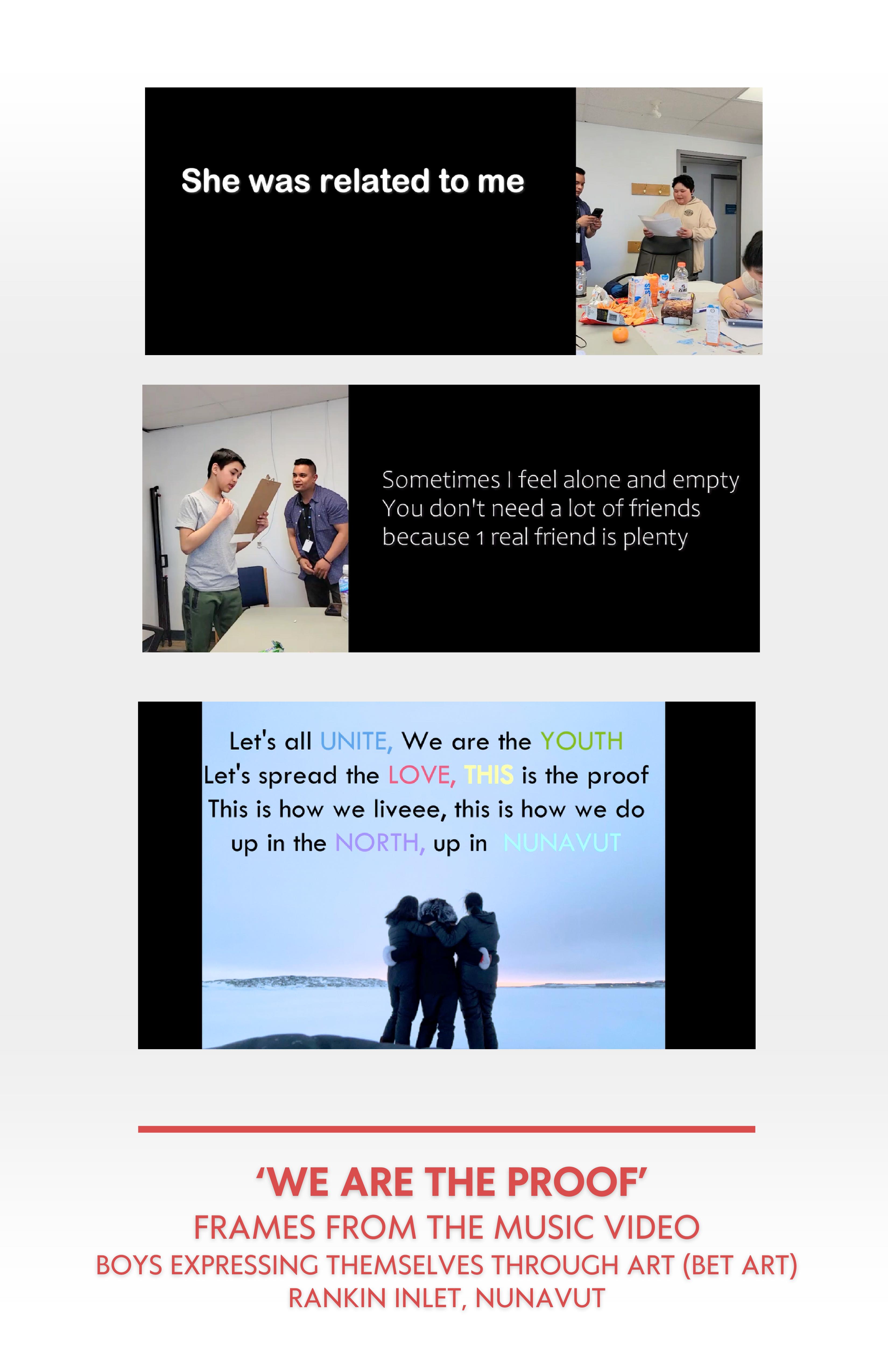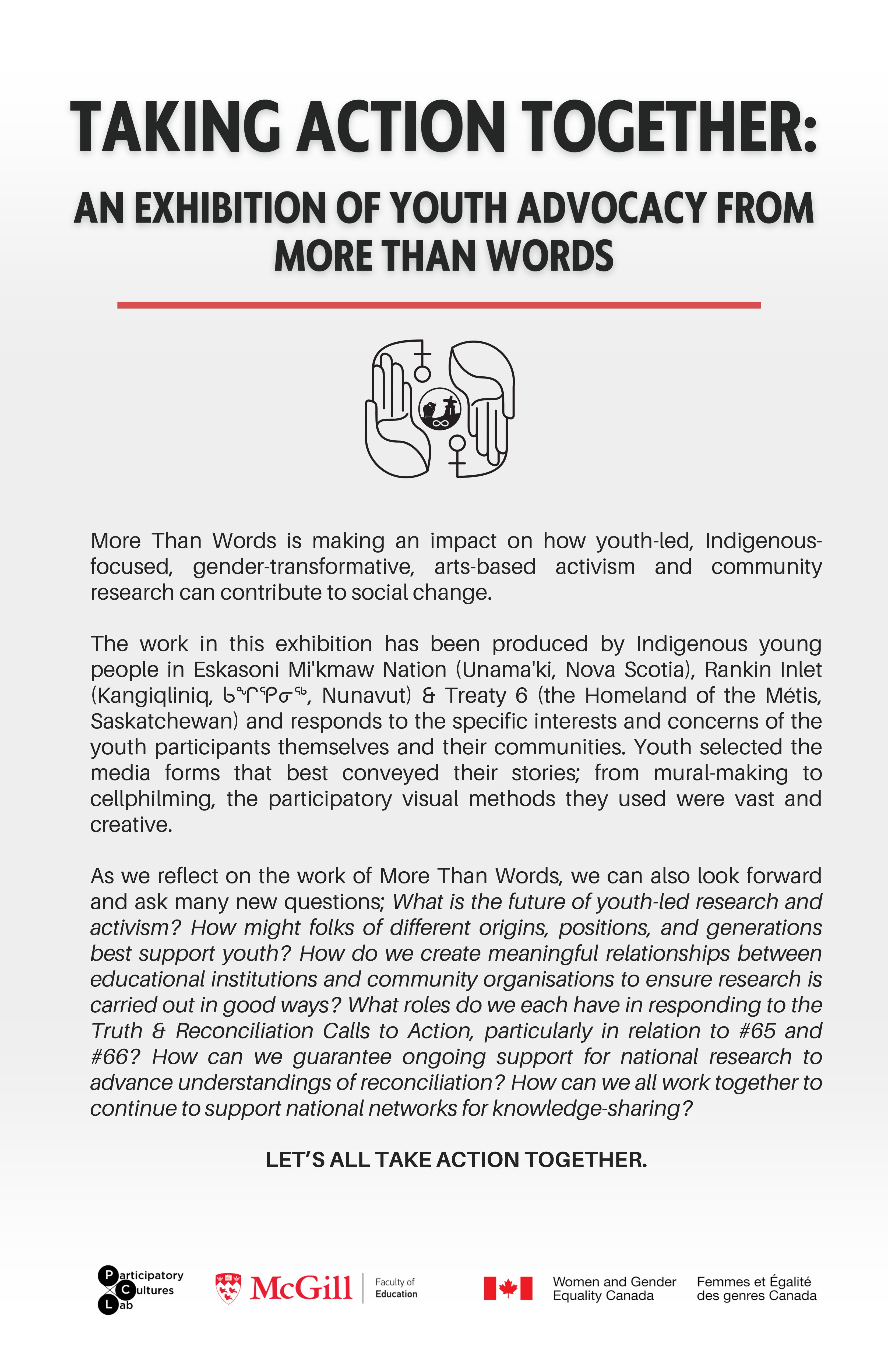 The work in this exhibition has been produced by Indigenous young people in Eskasoni Mi'kmaw Nation (Unama'ki, Nova Scotia), Rankin Inlet (Kangiqliniq, ᑲᖏᕿᓂᖅ, Nunavut) & Treaty 6 (the Homeland of the Métis, Saskatchewan) and responds to the specific interests and concerns of the youth participants themselves and their communities. Youth selected the media forms that best conveyed their stories; from mural-making to cellphilming, the participatory visual methods they used were vast and creative.