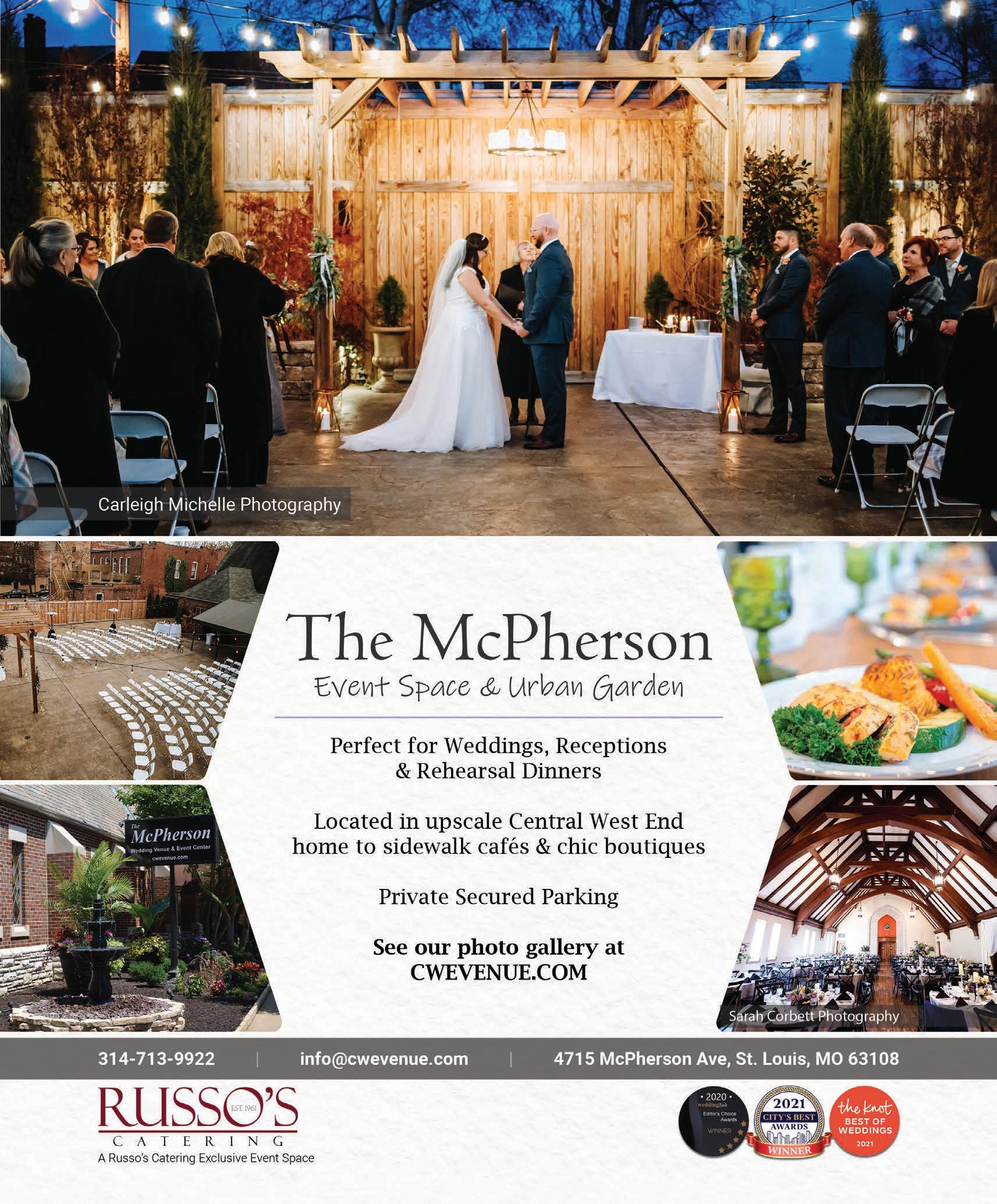 Located in Central West End, The McPherson is the perfect location for your rehearsal dinner. This historic venue features dramatic architecture details, a large private courtyard, bridal party suites & private secured parking. Choose from a curated selection of gourmet foods for your dinner party provided exclusively by Russo’s Catering. 4715 McPherson Ave • St. Louis, MO 63108 314-713-9922 • cwevenue.com