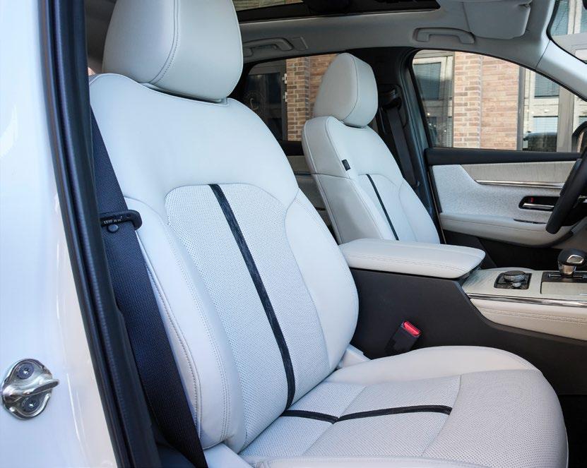 Pero no sólo de diseño y trato exquisito hacia el cliente vive el CX-60, sino que aporta además una altísima dosis de calidad y exclusividad a través de sus propuestas mecánicas, em pezando por su primer híbrido enchufable que no sólo ofrece 327 CV de puro carácter sino una eficiencia realmente sorprendente gra cias a un conjunto eléctrico que otorga una de las mejores autonomías en conducción Cero Emisiones del segmento, casi 70 kilómetros con cada carga de batería. Y para exclusividad y eficiencia, su novedoso motor diésel de nada menos que 3,3 litros de cilindrada y seis cilin dros al que acompaña un pequeño y sofisticado sistema micro híbrido con un pequeño motor eléctrico que le permite disfrutar de la etiqueta ECO de la DGT y de unos sorprendentes con sumos, 4,9 l/100 km. Y ello combinado con un sistema de tracción trasera para una dinámica de conducción sin duda diferente.