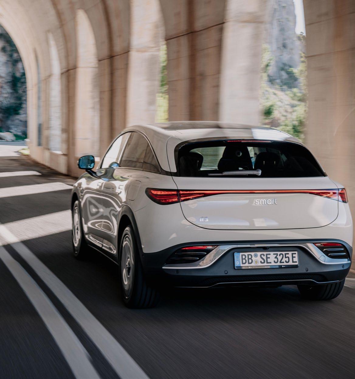 Mirado desde una perspectiva frontal, se parece mucho a su hermano pequeño el #1, pero la terminación del capó tiende hacia abajo, con unas salidas de aire laterales más finas y una parrilla activa de mayor tamaño. Y por supuesto presume de más anchura al irse hasta los 1,84 metros. Sigo mi paseo a su alrededor y de nuevo encuentro soluciones estéticas del otro SUV de la marca. La forma de presentar el logo en la aleta delantera derecha o la utilización de las manetas enrasadas son alguno de ellos. Un coche con una longitud total de 4,40 metros y que de nuevo recurre a una solución original en la parte final. Si en el #1 la forma del pilar parecía un corchete abrochado, aquí tiene una fuerte caída buscando un toque de deportividad con el que han querido impregnar a nuestro protagonista. El diseño de la iluminación posterior también sigue un patrón de marca y en cierta medida me recuerda a otros modelos eléctricos como el Mercedes EQA. Apretando un pulsador colocado en la letra A de la palabra smart nos da acceso a un maletero de 370 litros de capacidad, sumando otros 15 litros en la zona delantera.