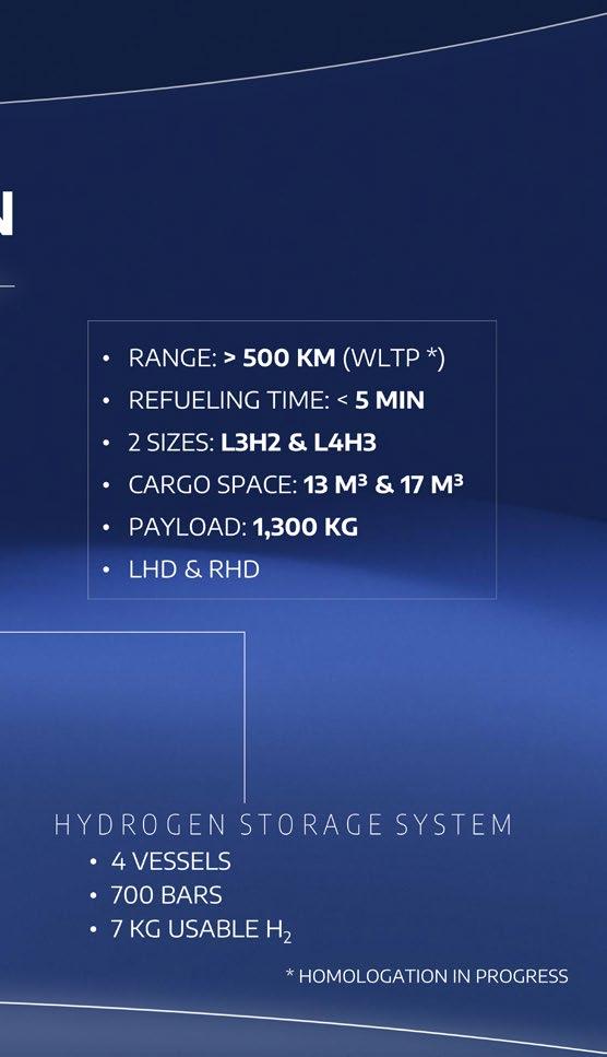 En el caso concreto de estas furgonetas grandes, se les ha montado un motor de 110 kW (150 CV) y 410 Nm, mientras que la pila de combustible tiene 45 kW (61 CV) de potencia. Disponen de cuatro depósitos de hidrógeno cuya capacidad es de 7 kg y con ello esperan poder homologar una autonomía cercana a los 500 kilómetros. Además, añaden una batería extra de 11 kW por si se acaba el gas, que se puede recargar con cable y que otorga otros 50 kilómetros más de rango. Todo ello sin perder vehículo completamente eléctrico.