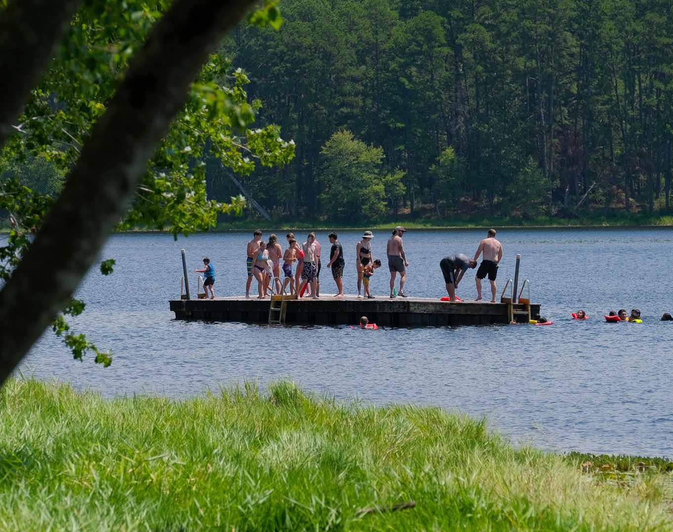 PARK VISITORS cool off in the lake's swimming area at Daingerfield State Park.
