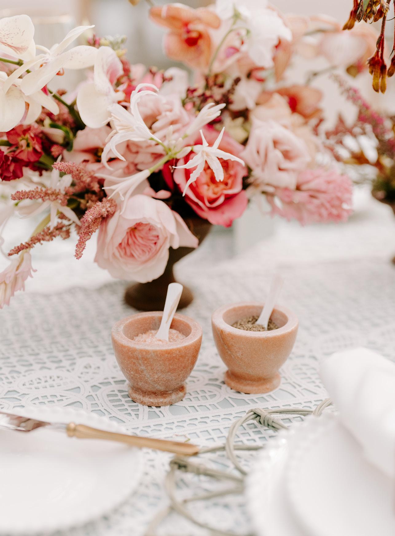 Rachel and Gerald chose their wedding color palette based on their sorority and fraternity’s colors, pink and cream, which were incorporated throughout the abundance of lush florals. Rachel shares, “The florals were the focal point of our overall style for our wedding. Every space felt as if it was in full bloom because it was!”