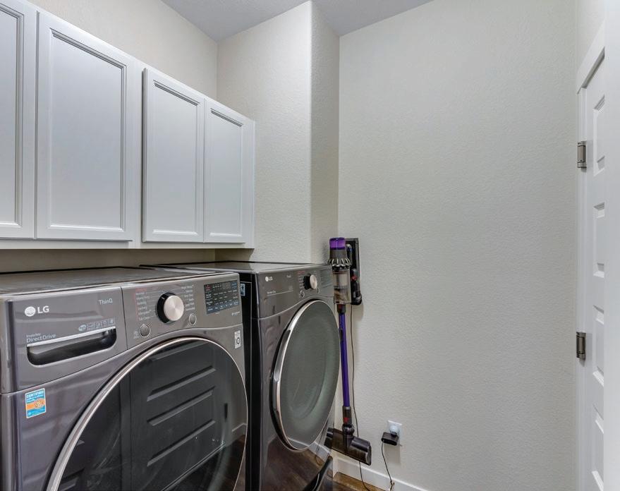 • Main floor laundry for convenience features cabinets and a pedestal clothes washer and clothes dryer which are both included