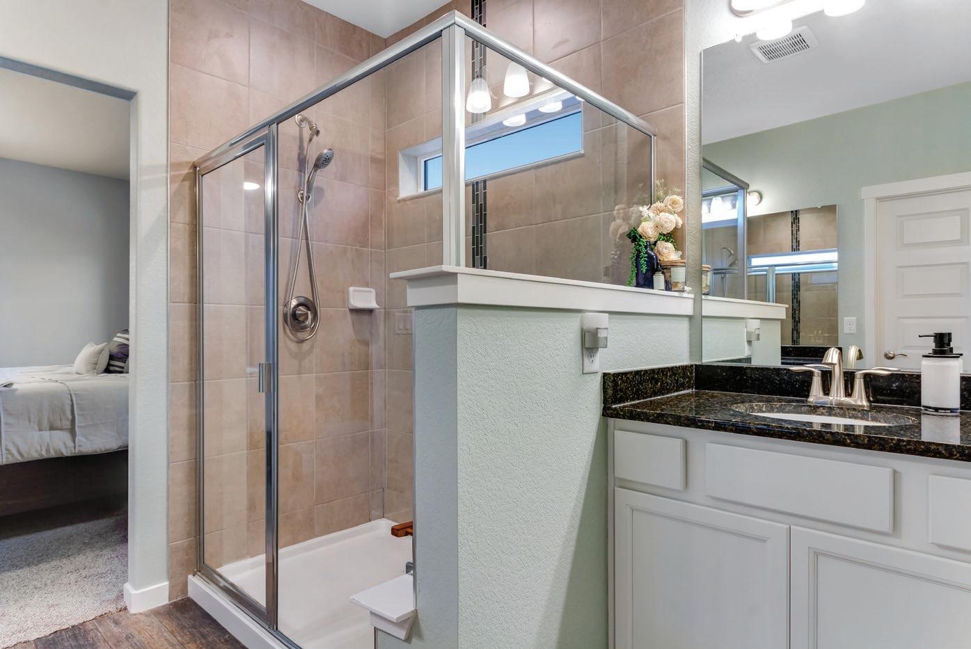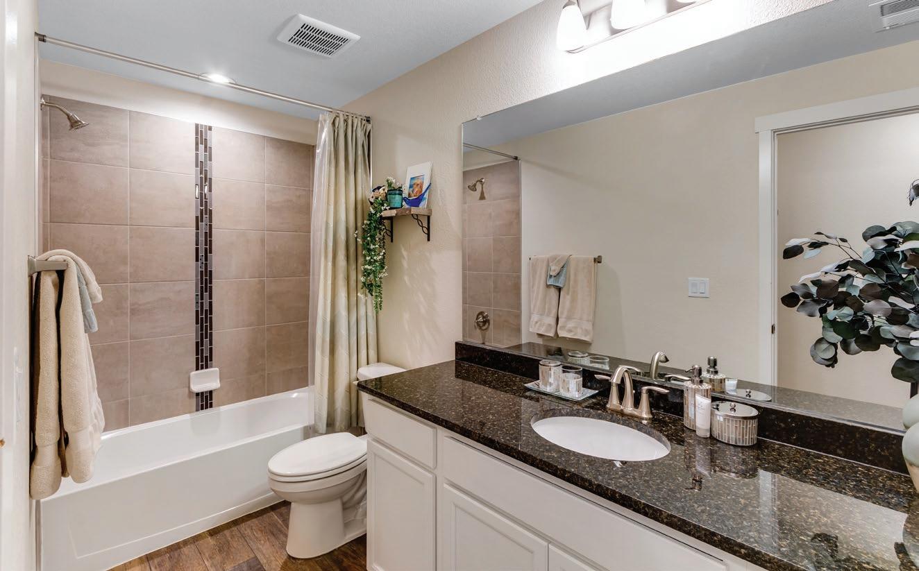 • Guest full bath features a full tile backsplash, lifted vanity and granite slab countertop