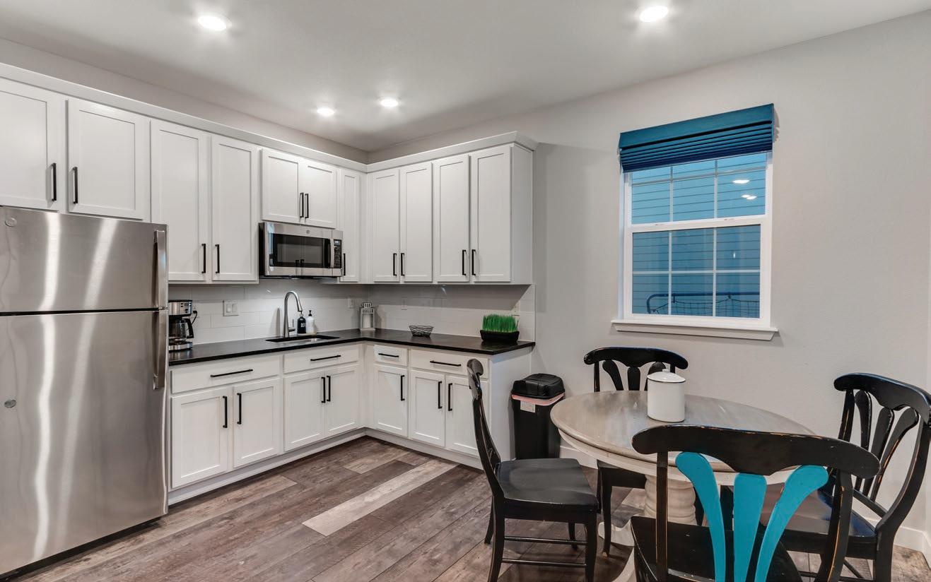 • Kitchen with microwave, refrigerator and plenty of cabinets and counterspace.