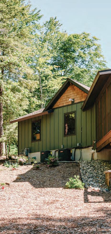 Designed by Scott’s son, Caleb Norris, the home uses earth-tone colors, woodwork and natural products to harmonize with its environment. That begins with the site, where the stone foundation, cedar shake siding and sage-colored board-andbatten exterior blend with the forest setting. The home’s structural white pine timbers, harvested from the site and its surrounding forest, were shaped in Norris’s own timber-frame shop. Those sturdy beams are complemented by rustic interior elements, like the stone fireplace that soars to the pine-clad cathedral ceiling.