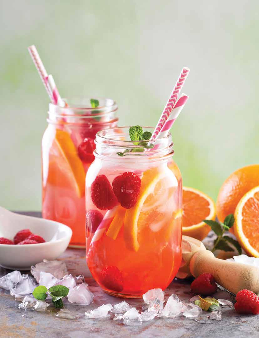 Muddle raspberries and mint leaves in the bottom of a glass. Add the juice of the orange and orange slices. Fill the glass with sparkling water and add ice if desired. Taste and add sweetener of choice if a sweeter drink is preferred. Garnish with the mint sprig and enjoy. Recipe and photo: Kendra Campbell