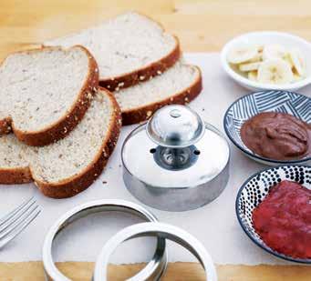 1 Place two slices of bread on a cutting board. Use a sandwich sealer, mason jar ring or circular cookie cutter to cut the bread into circles. (Set the leftover crusts aside for another use.)