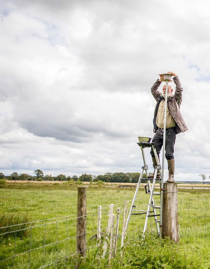 adat we bij de schaapskooi Achter ’t Zaand een eindje het Dwingelderveld in zijn gelopen, plant Guido Nijland z’n keukentrap naast een paal. Op de top zit een zilverkleurig hoedje. De gepensioneerde ecoloog klautert de trap op en begint het hoedje te demonteren. Het zit boven zijn hoofd, zodat hij de handelingen blindelings moet uitvoeren. Hij weigert de aangeboden hulp. Dat kan de routine alleen maarverstoren. Onder het hoedje zitten de filters die de luchtkwaliteit in dit deel van het natuurgebied meten. Guido pakt de filters zorgvuldig in en zal ze naar een gespecialiseerd laboratorium opsturen voor analyse. Als de nieuwe filters op hun plek zitten en het hoedje weer op z’n plaats is gezet, komt Guido van de trap en loopt door naar een uit de kluiten gewassen eik die even verderop staat. Hij trekt van verschillende takken bladeren af en stopt die in een zak. Ook die bladeren gaan naar het laboratorium. Zo is het afgelopen jaar op zeven locaties in Drenthe en op de Veluwe gemeten of en welke bestrijdingsmiddelen er in de lucht zitten. Begin deze zomer verscheen het