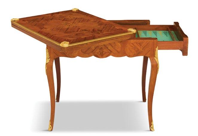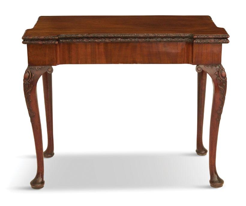 19th century, the rectangular, hinged top with projecting corners and floral-carved edges, opening to a baize-lined gaming surface and corner wells, raised on cabriole legs headed by shield carving and ending in pad feet. h. 28”, w. 35”, closed d. 17-1/2”