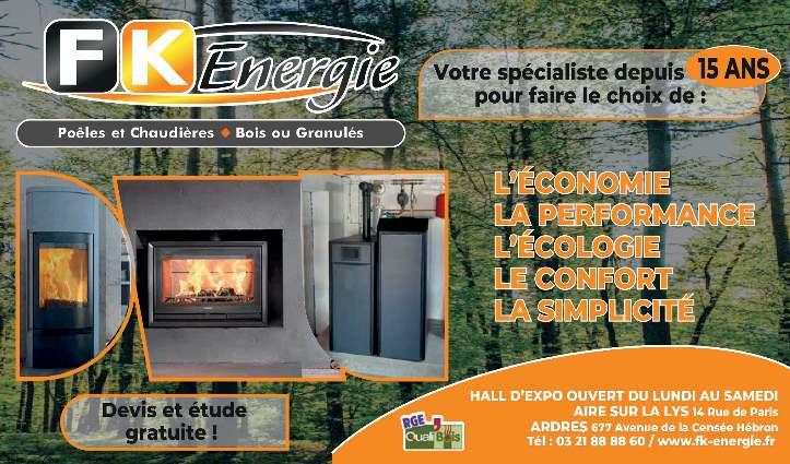 FK énergie est une entreprise airoise, située rue de Paris. Fort de son succès, elle a ouvert il y a quelques années un second magasin à BoisenArdres. Voilà un spécialiste de la pose et l’installation d’un poêle à bois et ou à granulés, de l’installation et l’entretien de foyers pour cheminée, de chaudières, de l’habillage d’équipements thermiques, de l’entretien et du dépannage de vos installations. Ses équipes sont réactives et formées. Elles savent procurer de précieux conseils au moment du choix pour équiper sa maison, en s’adaptant à vos souhaits et la configuration de votre habitat. Au moment où la préservation de l’environnement s’impose comme une évidence, voilà leurs solutions de combustibles écologiques! Et économiques aussi avec la flambée du gaz et de l’électricité.