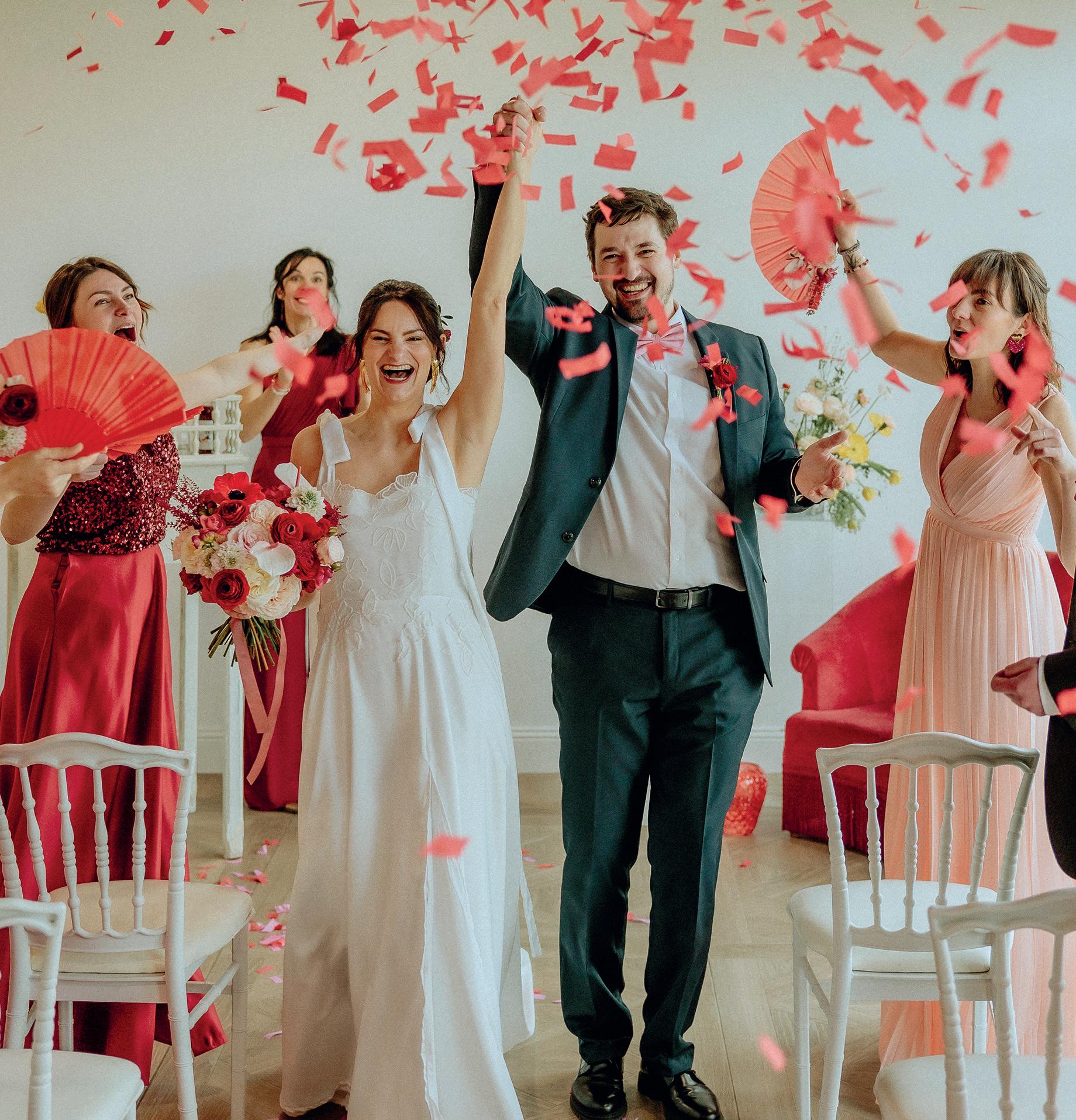 Osez les couleurs peps : « De l’orange, du rouge, du bleu, du violet, du jaune, le tout en dosant bien. La couleur, ça peut seulement être dans les fleurs, dans les éléments de déco ou dans la papeterie. Les tons pastel marchent bien pour tout ce qui est baby shower, naissance, maternité, etc. On n’oublie pas non plus la couleur de l’année, le pantone de l’année 2025 : le mocha mousse. »