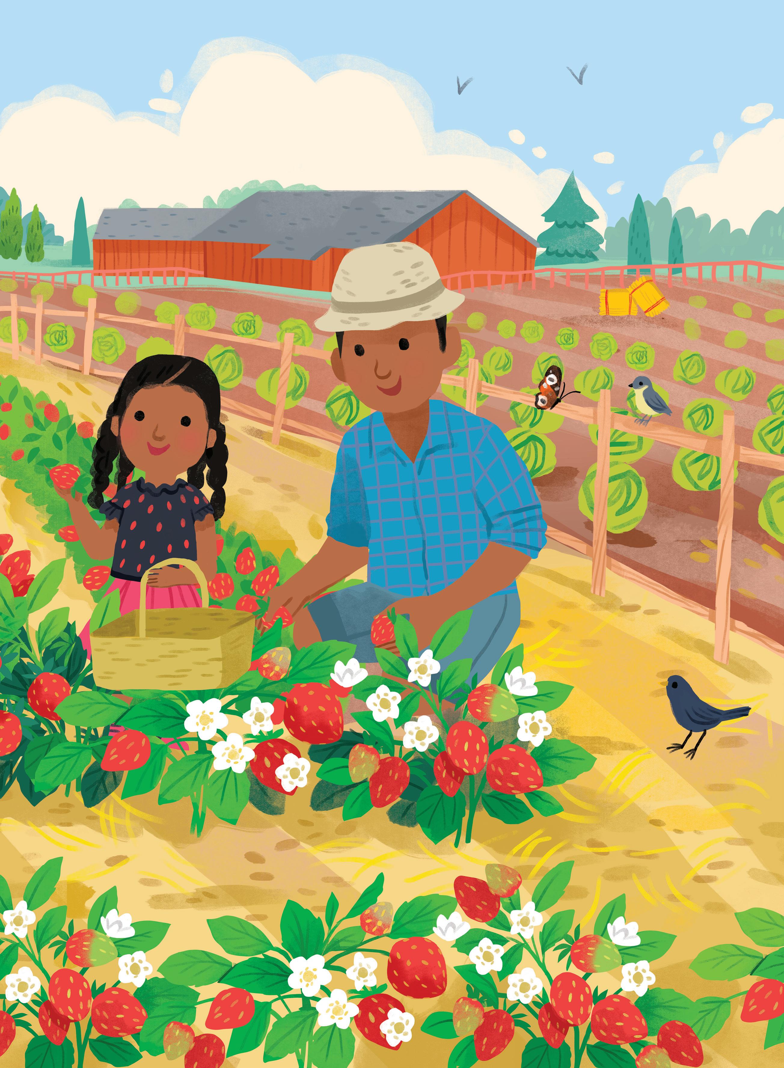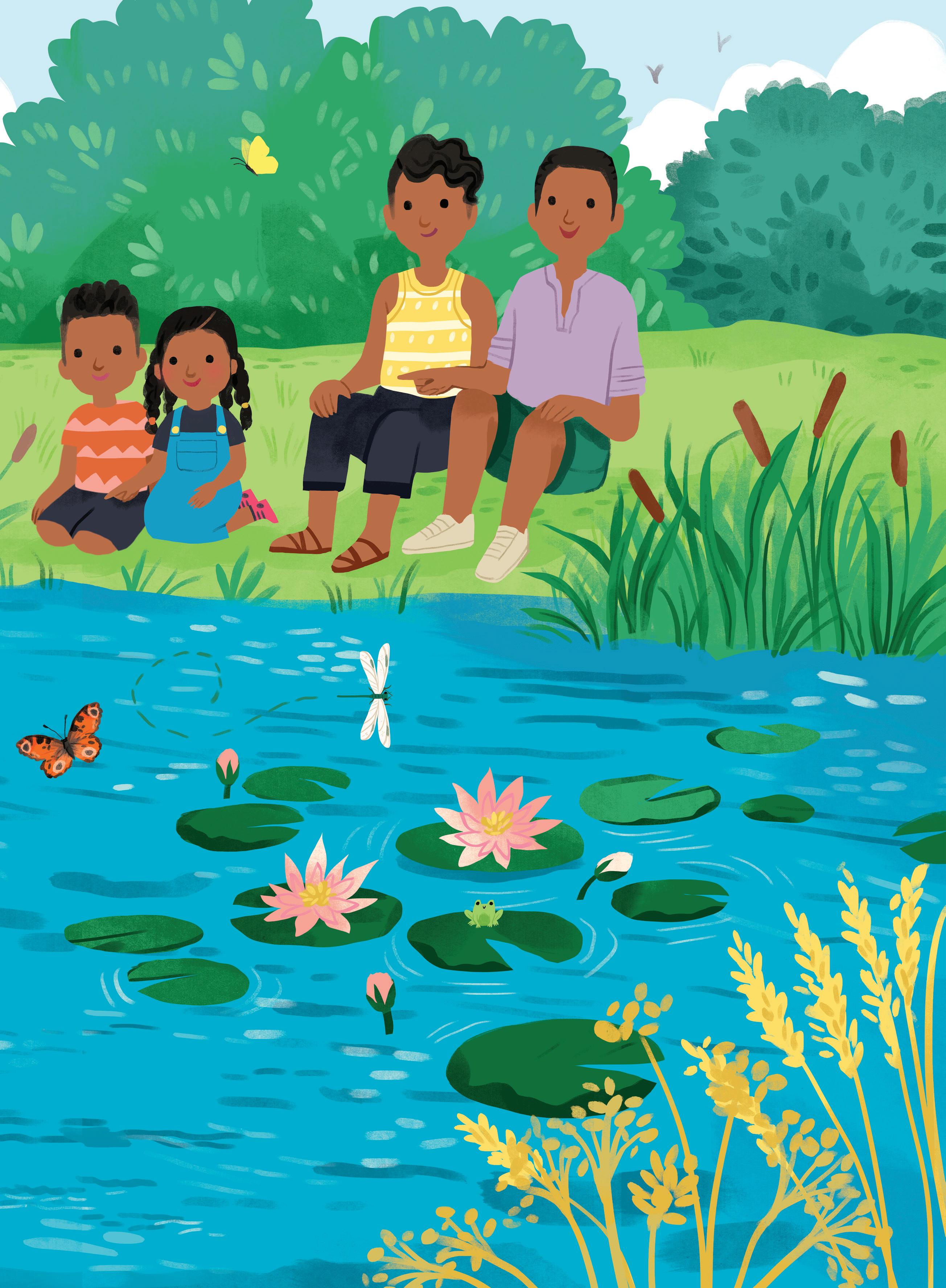 The sun is shining in the sky. We look for buzzing bees and pretty swallows flying by.