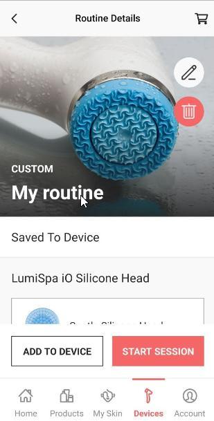 Vil du redigere en lagret tilpasset hudpleierutine, går du til → se på LumiSpa rutiner → Trykk på rutinen du vil redigere → Trykk på blyanten for å redigere og justere
