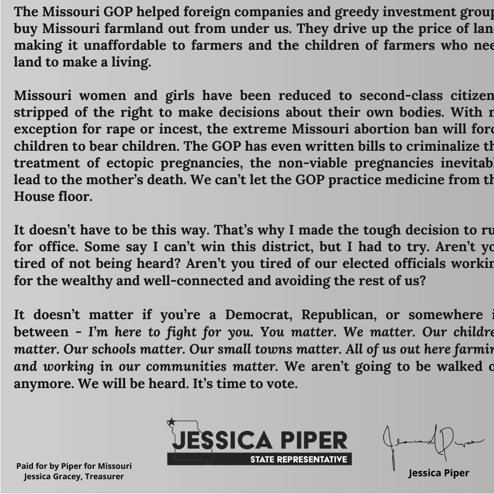 Paid for by Piper for Missouri, Jessica L Gracey, Treasurer