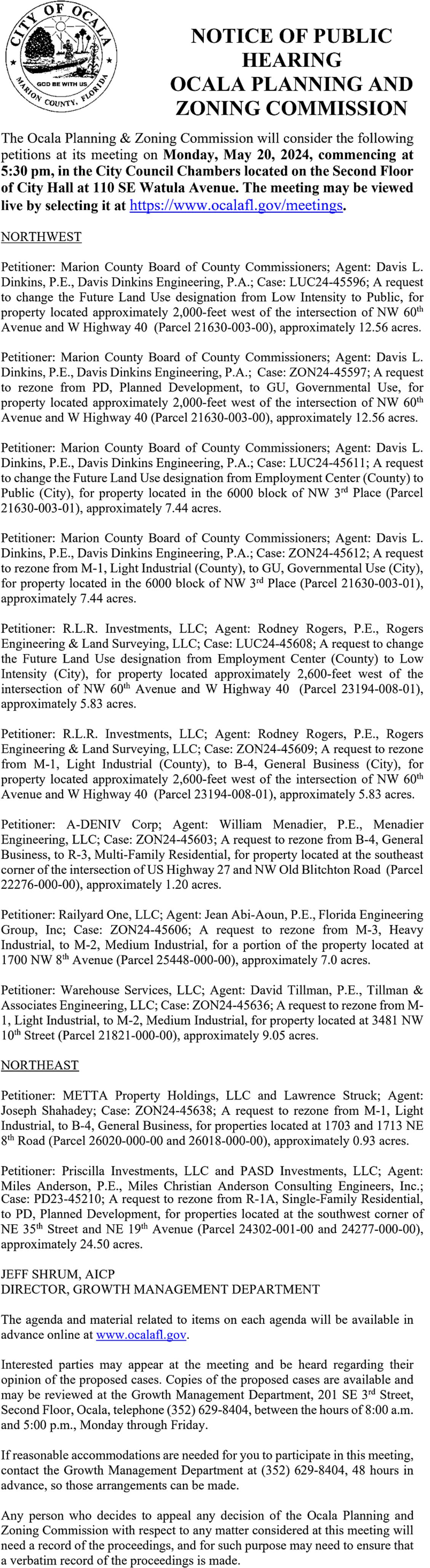 Proposed activity: Commercial. Project name: Ocala North Development Road. Project size: 3.01 acres, Location: Section 17 Township 15 South, Range 21 East, in Marion County. Outstanding Florida Water: no. Aquatic preserve: no. The application is available for public inspection Monday through Friday at 7601 U.S. Highway 301 North, Tampa, Florida 33637 or through the “Application & Permit Search Tools” function on the District’s website at www.watermatters.org/permits/ . Interested persons may inspect a copy of the application and submit written comments concerning the application. Comments must include the permit application number and be received within 14 days from the date of this notice. If you wish to be notified of intended agency action or an opportunity to request an administrative hearing regarding the application, you must send a written request referencing the permit application number to the Southwest Florida Water Management District, Regulation Bureau, 7601 U.S. Highway 301 North, Tampa, Florida 33637 or submit your request through the District’s website at www.watermatters.org . The District does not discriminate based on disability. Anyone requiring accommodation under the ADA should contact the Regulation Bureau at (813) 985-7481 or 1(800)8360797, TDD only 1(800)231-6103.”
