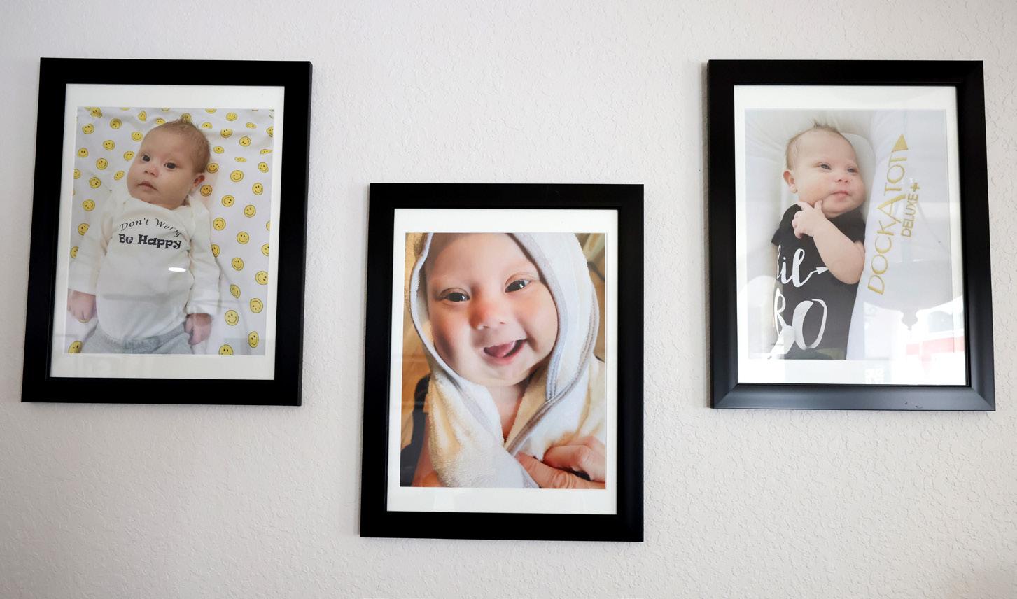 From top: Photos of Zion Joe Sarmiento, who passed away on Oct. 8, 2021, are shown in the Sarmiento’s Marion Oaks home on Tuesday, Oct. 1, 2024. Bobbi Sarmiento talks about some of the items set up for her late infant son, Zion Joe Sarmiento, in a room dedicated to him. [Bruce Ackerman/Ocala Gazette] 2024.