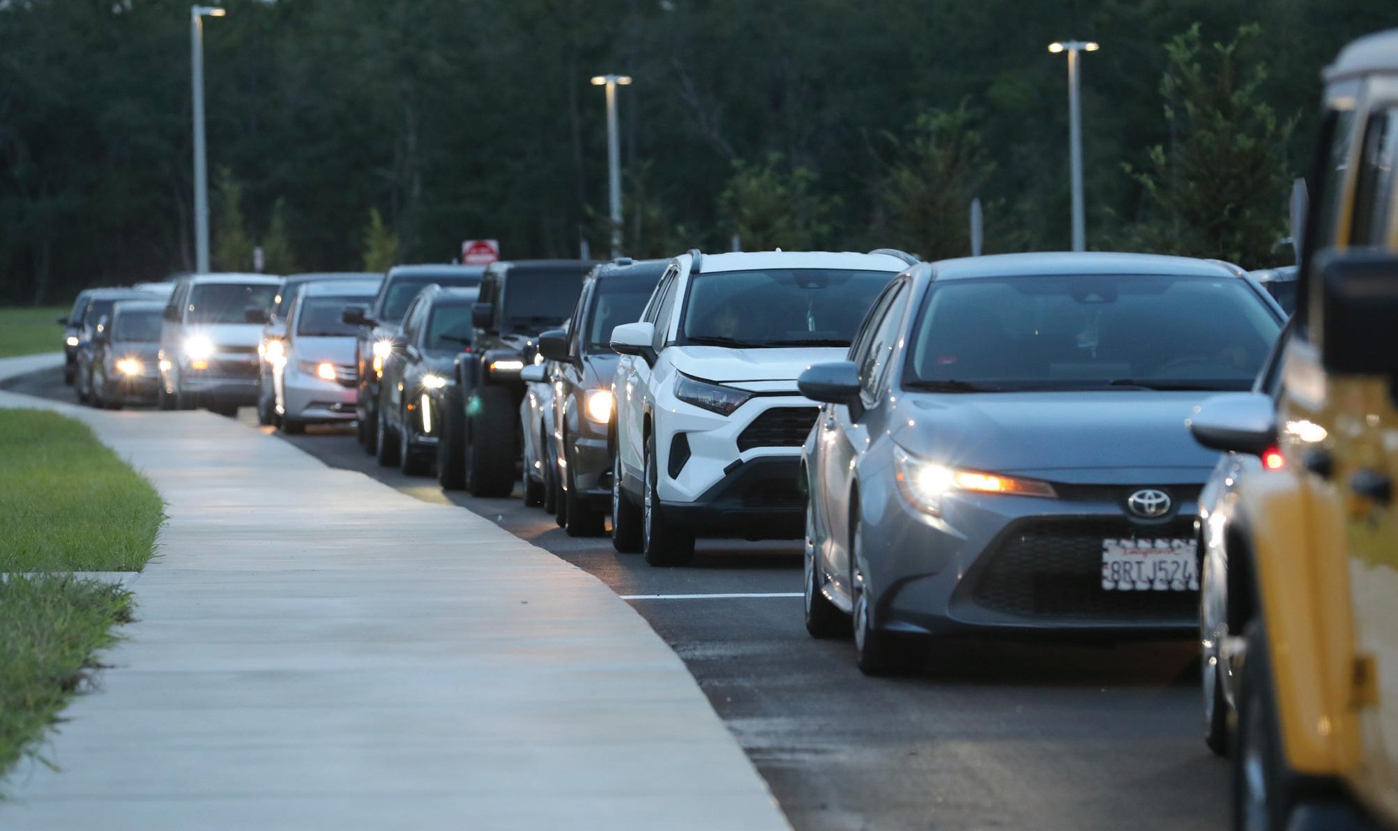 Motorists negotiate the entrance to Ross Prairie Elementary School where there are no flashing yellow lights for the 20 mph speed limit in the school zone on the first day of school at the new Ross Prairie Elementary School in Marion Oaks, Fla.