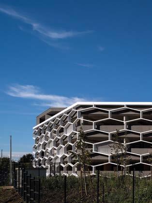 Az új parkolóház az eredeti elképzelés szerint a Budapest ONE irodapark homlokzatképzésére reflektált volna, hangsúlyozva a két épület kapcsolatát, ám a tervezés során végül a funkcionális megkülönböztetést is figyelembe véve teljesen önálló karaktert kapott. Az épület karakterét alapvetően fedett-nyitott jellege, szerkezeti őszintesége és a homlokzat egyedi, áttört struktúrája határozza meg. Az ipari jelleget erősítő masszív nyersbeton felületek és az épület egyedi megjelenését adó könnyed, fehér színű, hexagonális elrendezésű, helyenként terpesztett lemez betétekkel ellátott alumínium homlokzati rendszer izgalmas kontrasztot alkot. A homlokzat karakteres mintázatát egy Ford modell hűtőrácsa ihlette, ezzel