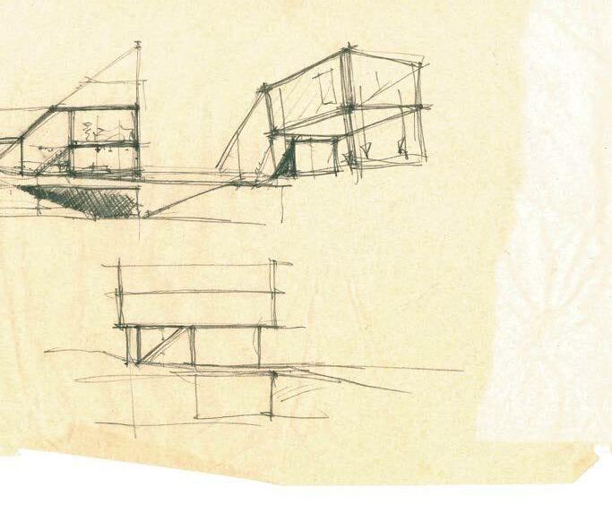 Megsárgult skiccpausz lapok kerülnek elő egy elegánsnak távolról sem mondható mappából. Gyűrődések, tépett lapszélek, összefüggéseket kereső ceruzavonalak. Ritkaság mostanában, hogy az elemezni, bemutatni tervezett ház kapcsán meg ismerhetővé válnak a tervezési folyamat korai, óhatatlanul zsákutcás, majd utat találó, végül révbe érő rekvizitumai. Nyilvánvaló, hogy ezek a vázlatok nem pusztán a tervezők „kihangosított” gondolatai, hanem a megbízó, illetve a tervezők közötti párbeszédek, valamint a folyamat közben felmerülő problémák és válaszok elbeszéléseinek lenyo matai. Építészeti skiccek kisugárzása hasonlatos az irodalmi kéziratok kisugárzásához, hozzátéve, hogy az írt betű és a nyomtatott betű transzformációja kevésbé radikális. A rajzi kód, vagyis a skiccek, majd a tervrajzok, a részletrajzok, a kiviteli tervrajzok betonba, téglába, üvegbe, acélba, építő mozdulatba, izomerőbe, építőgépbe, eszközbe testesülé se a valódi transzformáció, maga az átlényegülés csodája.