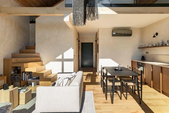 Az ingatlan varázsa egyértelműen a galé riás, amerikai konyhás nappaliban rejlik, ahol összemosódik a kint és bent, a fent és lent