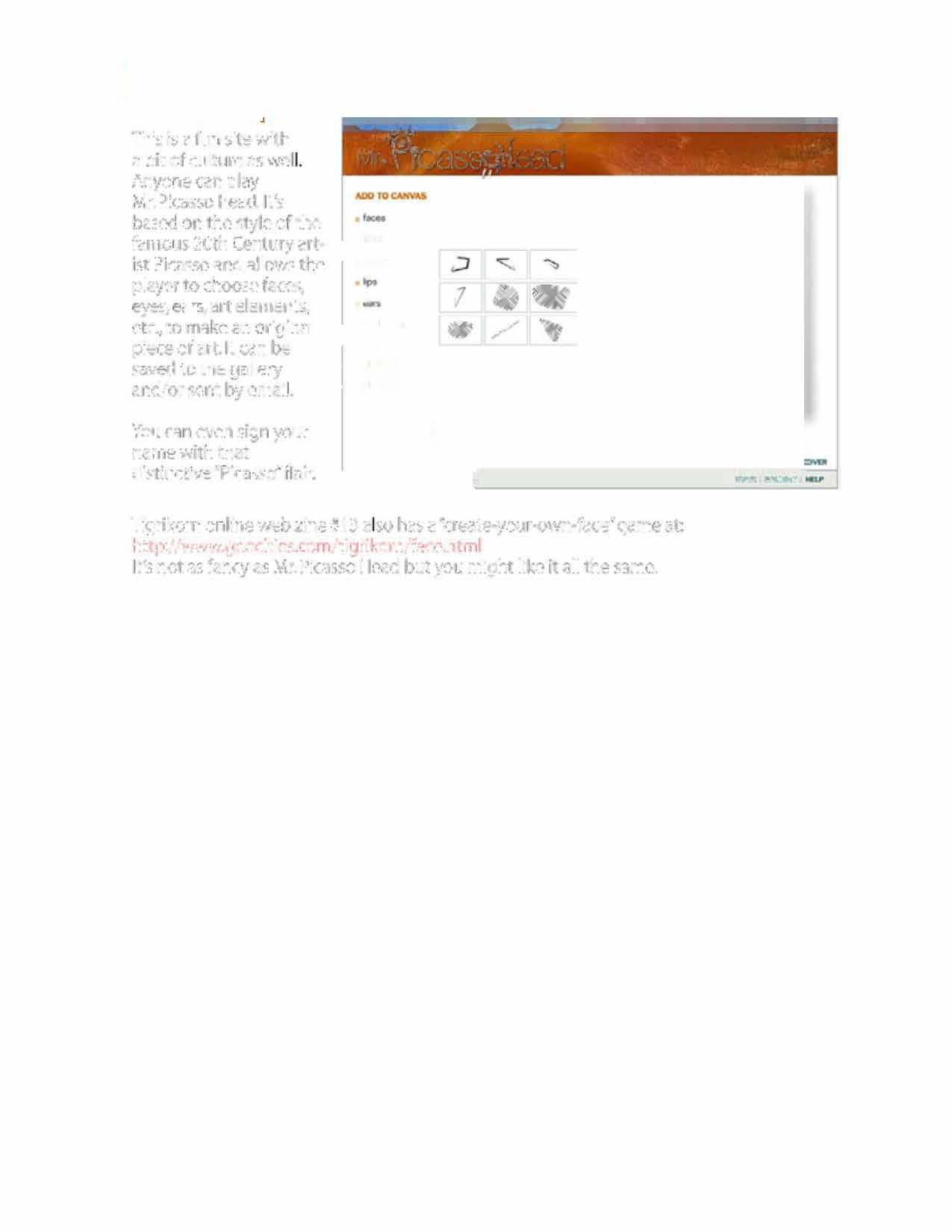 Mr.Picasso head.It's based onthestyle ofthe famous 20th Centuryartist Picasso and allows the playerto choose faces, eyes;ears,art elements, etc.,to make an original piece ofart.itcan be saved to the gallery and/orsent byemail.