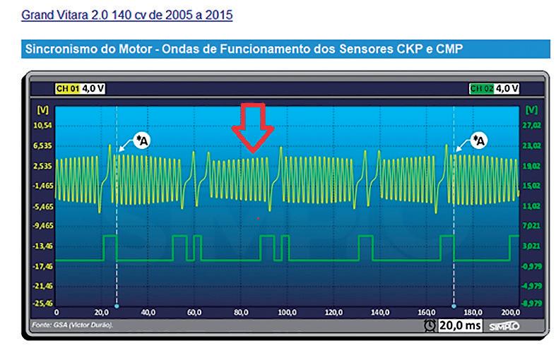 o período do sinal. O período de uma onda, que é seu tempo total de trabalho, é a informação mais importante nesse tipo de sinal, pois informa de fato a frequência com que cada pico de tensão ocorre e a falha correta da roda fônica ou referência de fase.
