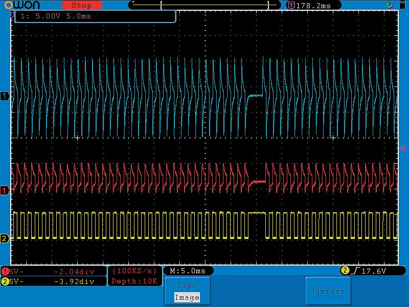 Em alguns sistemas, um único C.I. pode realizar todas essas funções (amplificação, conversão e inversão). Nesses casos, até mesmo o diodo retificador de meia-onda costuma estar dentro do C.I., tornando muito mais fácil a análise, visto que todas as etapas que consideramos acontecem em um único ponto do circuito. Portanto, com dois canais do osciloscópio já é possível verificar entrada analógica já retificada e saída digital convertida e invertida. IMAGEM 7 / IMAGEM 8