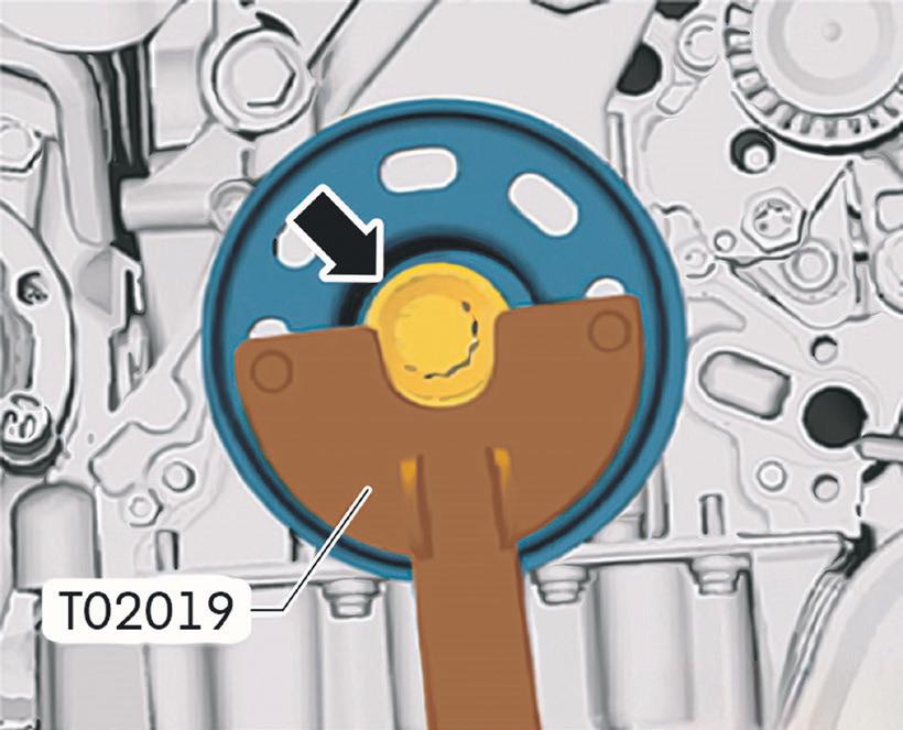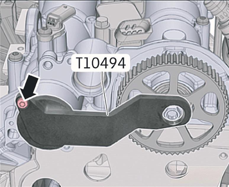 Já com as coberturas retiradas, instale a ferramenta de imobilização dos eixos T10494. Para a instalação dessa ferramenta, não será necessário remover a engrenagem de acionamento da bomba d’água, tampouco a minicorreia. É importante lembrar que, uma vez imobilizados os eixos, eles não po -