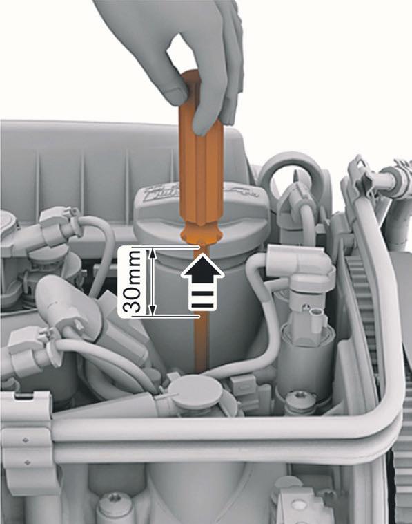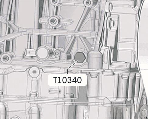 Remova o bujão lateral, localizado no bloco do motor, abaixo do conjunto de escapamento. No seu lugar, instale o pino de imobilização da árvore de manivelas T10340. Este irá impedir que o motor gire no sentido horário, contribuindo para o procedimento de sincronismo.