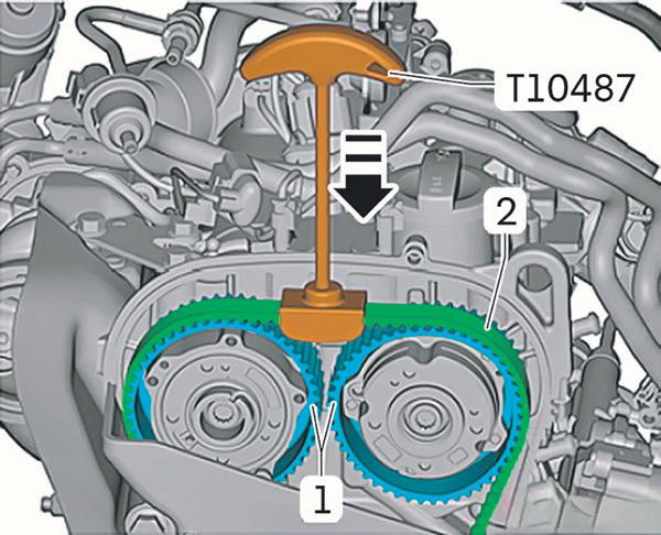 Dificuldade de instalação da T10494 –Por conta do tensionamento da correia dentada, a ferramenta de imobilização dos eixos T10494 sofre dificuldade de se encaixar nas fendas dos eixos . Nesse caso, você deverá exercer uma tensão na correia dentada exatamente no centro, entre as duas polias dos comandos. Para isso, utilize a ferramenta T10487, cujo formato é apropriado para se encaixar na correia e permitir que o mecânico exerça força contra ela.