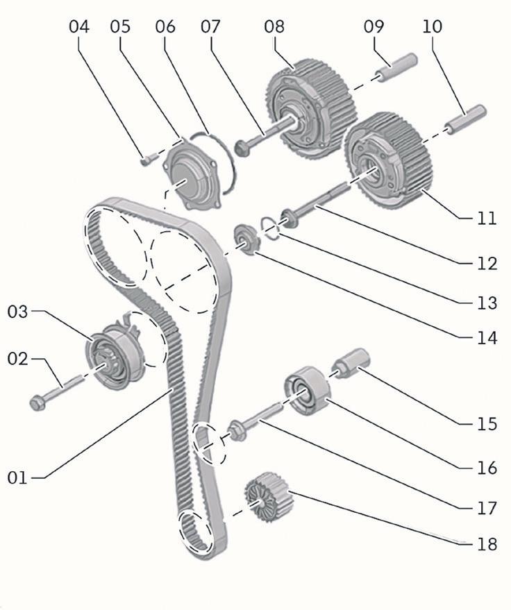 lado e a colocação de uma nova peça, que, inclusive, deverá ser inserida com um novo parafuso de fixação. Deixe o tensor da correia dentada instalado no seu local, porém com o parafuso de fixação solto, até que a nova correia dentada tenha sido instalada.